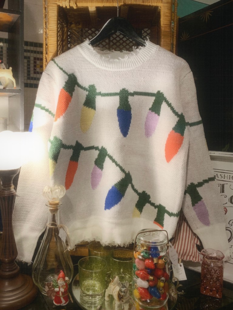 you’ll look cute in this Christmas sweater! string lights wrap around the whole piece–front, back, and sleeves!
