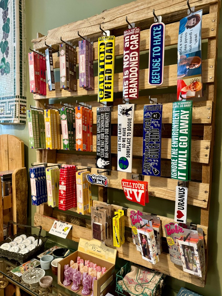 A peek at some bumper stickers, stickers, keychains and small stocking stuffers.